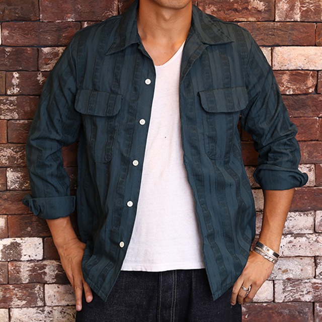 50'sスタイルに多いオープンカラー、BOXシルエット、衿の袋縫い、フラップポケットなどが特徴的なシャツです。