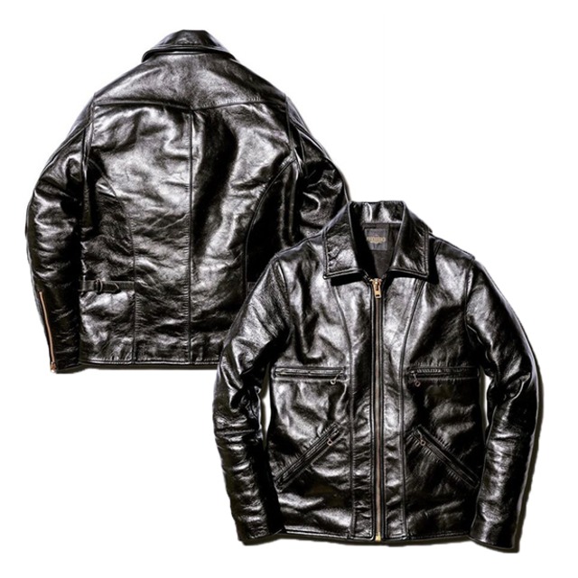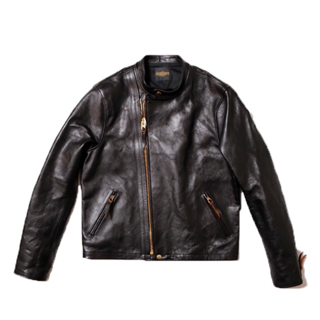 スポーツタイプの襟付きシングルライダースジャケット。 革は1.3mm厚の革で、フルベジタブルタンニン仕上げのポーランド産ホースハイドを使用。 染料染めのホースハイドレザーで、適度な硬さと光沢感のある仕上がりです。 また、裏地はコットン素材を使用し着用し易い裏地となります。 茶芯仕様なので、着込むうちに下地から茶の色が浮かび上がり経年変化も楽しめます。