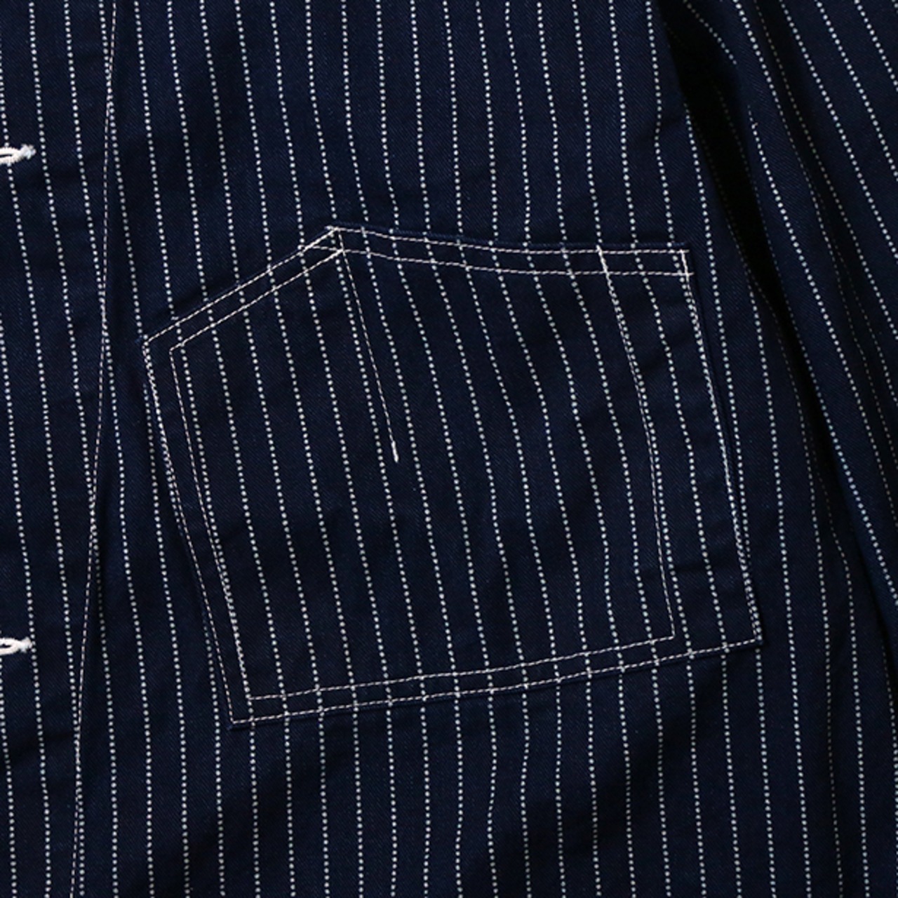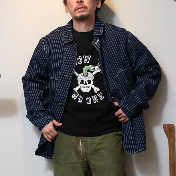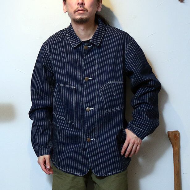 JELADOが長年保有する1920年代以前のSWEETORRの変形ポケットカバーオールを踏襲し、LASTRESORT青タグから派生したINDIGO WABASHストライプ生地を使用した特別なカバーオール。