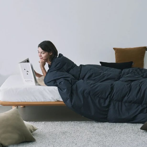 セミダブル以上のベッドで使えるサイズ(H210cm×W145cm)、寝る時はもちろん、ソファでくつろぐ時にも嬉しい大きさです。軽くて暖かい800FPの上質な羽毛(ダウン)を使用。程よい弾力と、心地良い肌触りで、優しく柔らかく体を包み込みます。