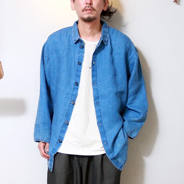 インディゴ染めしたリネンシャツジャケット。