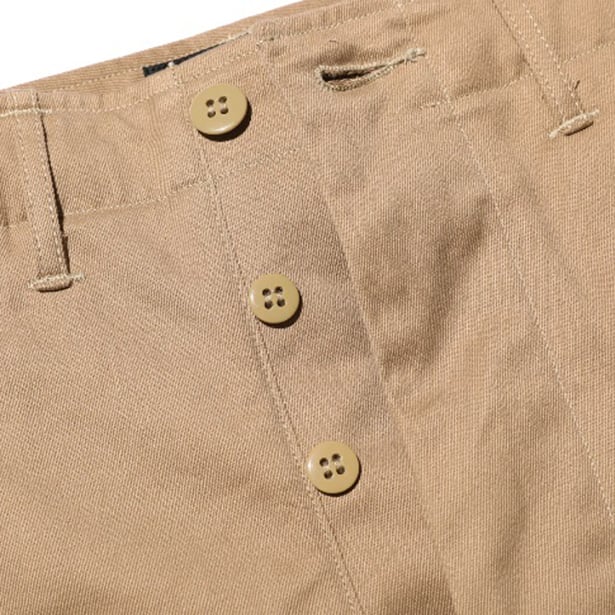 ラストリゾートデニムと同様に数種類のデッドストックのM41 KHAKIの中から厳選した個体を解体し、糸の太さ、ムラの形状、撚り回数、撚り方向など当時の生産背景、技術力を想定しながら徹底的に作り込んだチノパン。